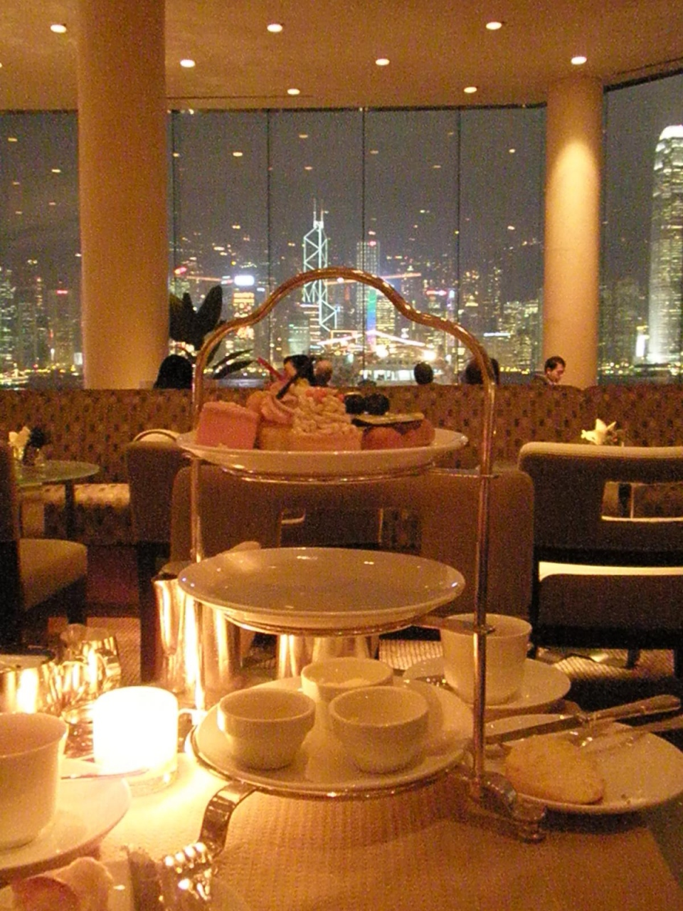 九龍サイド(パークホテル)に引越しして、再度素敵なハイティーにチャレンジ。ペニンシュラがいっぱいだったので、インターコンチに、17時45分に入って大正解。(ハイティーは18時まで)どんどん夕暮れになってきて、夜景がすばらしく(表紙参照)2時間くらいゆったりできました。
