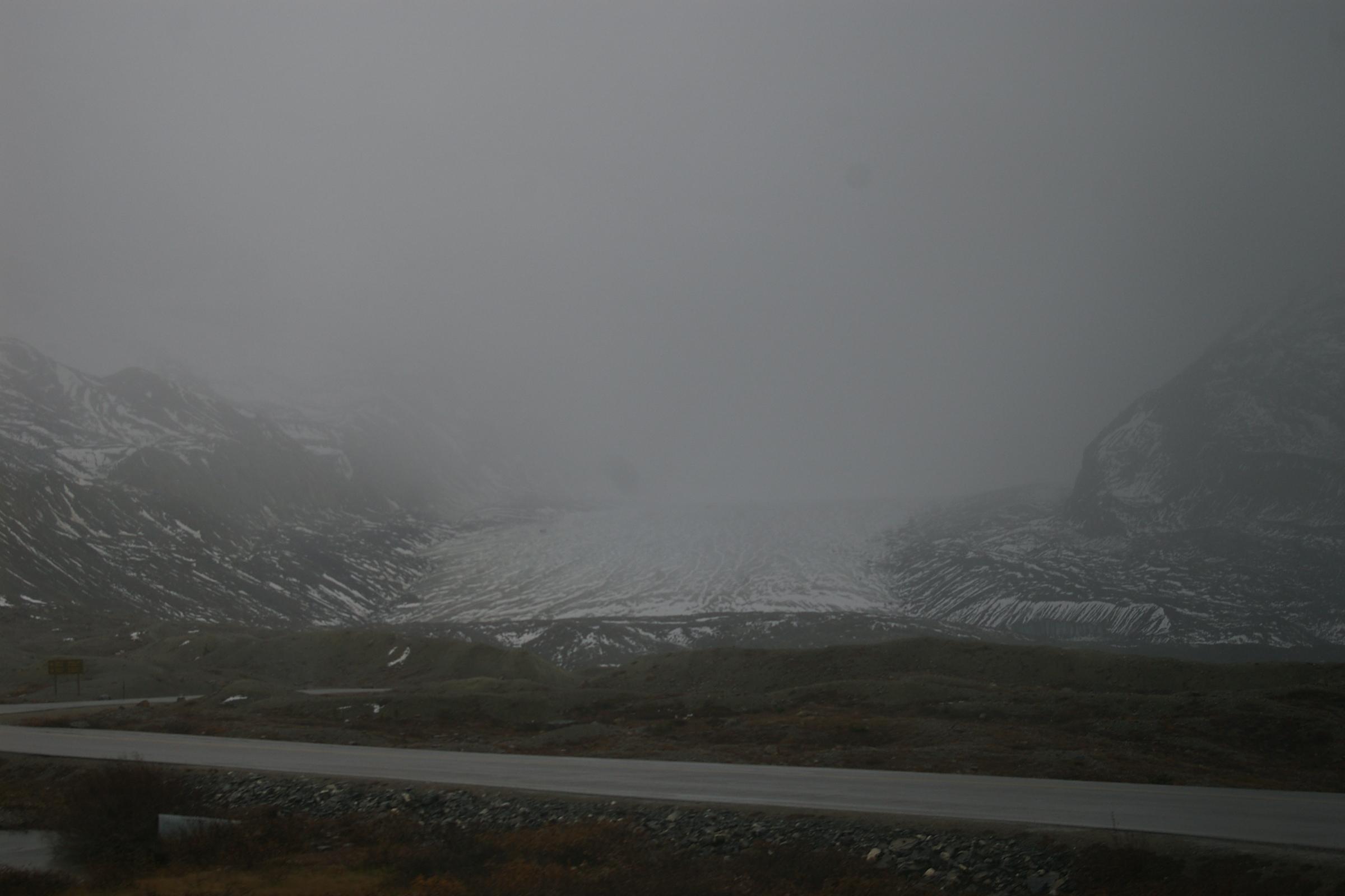 辛うじて、氷河の奥の方を向いて写真を撮ってみる。吹雪すぎて向こうが全然見えなくて、大きさが伝わってこないのが悔しすぎる。一応6kmくらい続いてるとこの事。