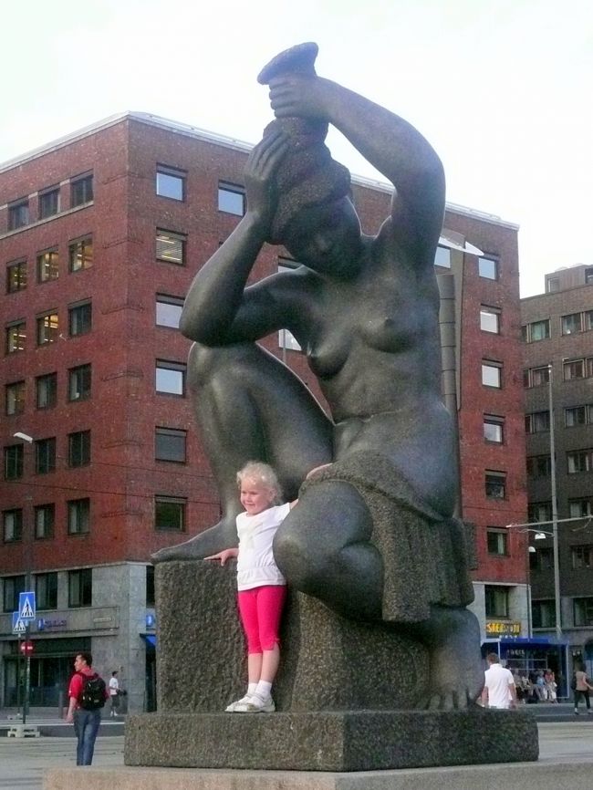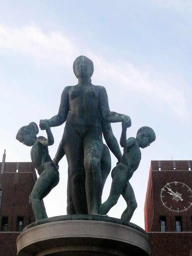 市庁舎前の広場の彫像達の様な親子が彫像と戯れていた。