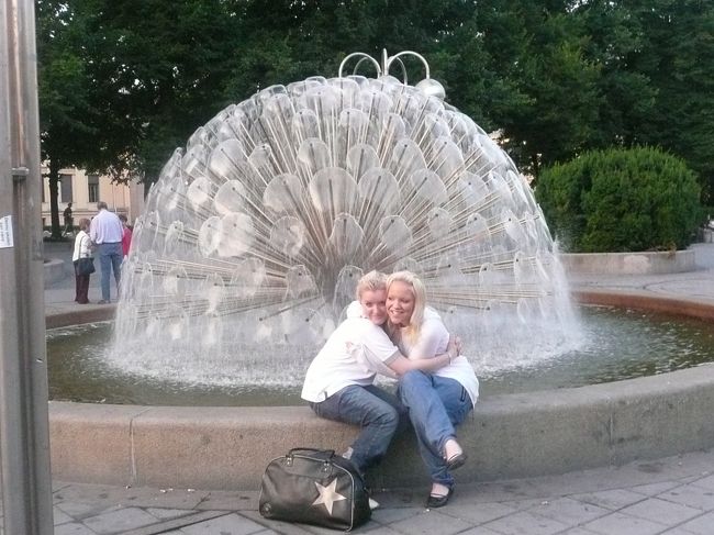 噴水の淵に腰を下ろし話し込んでいる2人の若い女性に、噴水と一緒に写真を撮ってもいいか尋ねたら、思いもかけずポーズまで取ってくれた。