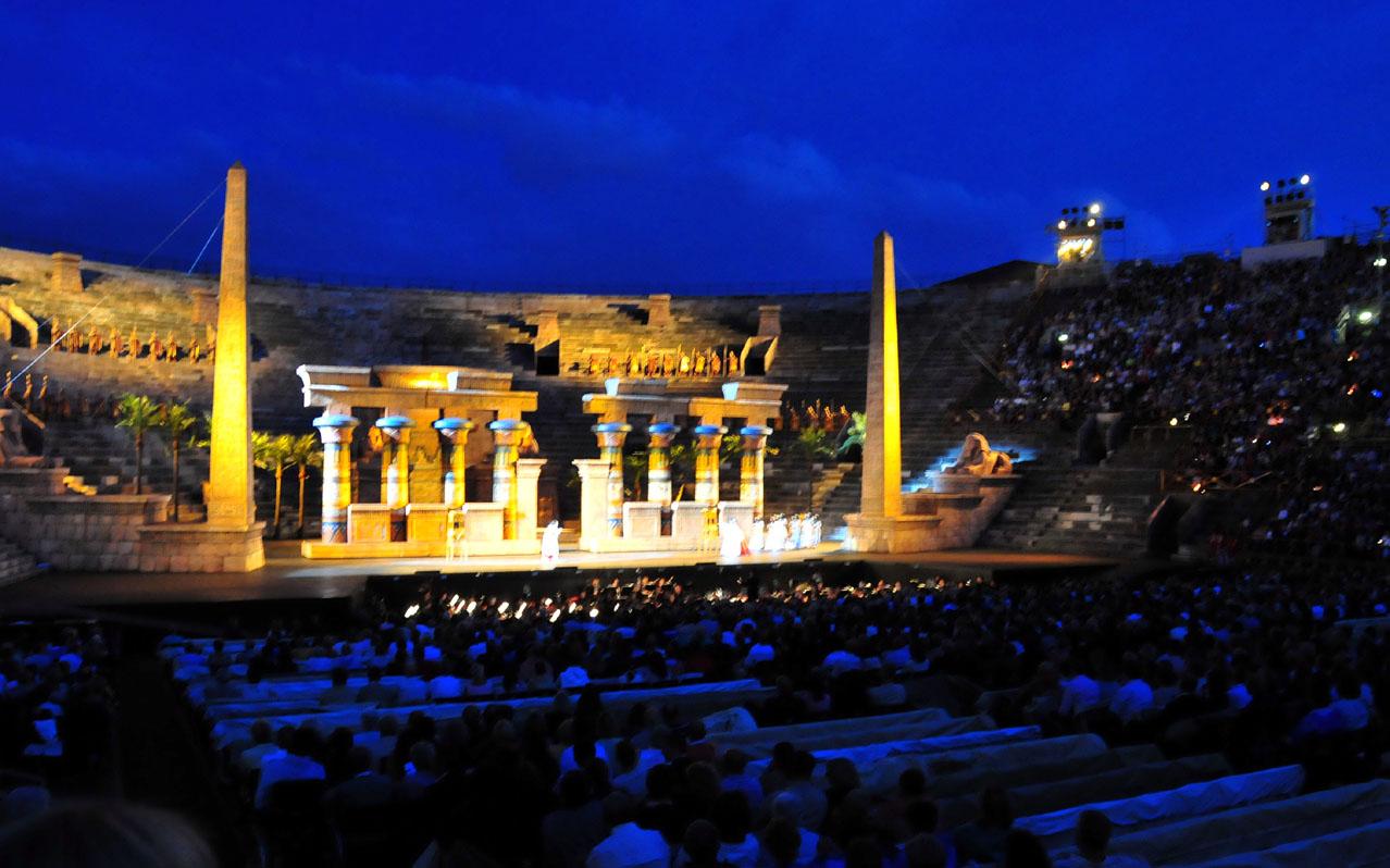 スペクタクルな演出もしばしば話題になり象が登場したり、1912年にはピラミッドの前で上演された。ヴェローナでは1913年に上演される。