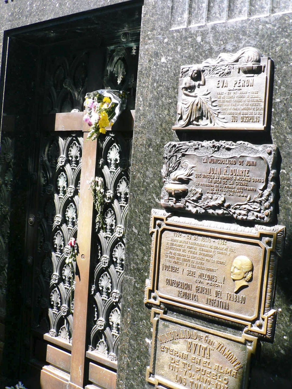映画で脚光を浴びた、非嫡出児として苦難の幼年期を送りながらペロン大統領夫人にまでのぼりつめたエビータの墓。レコレータ墓地の中では目立たない墓だ。