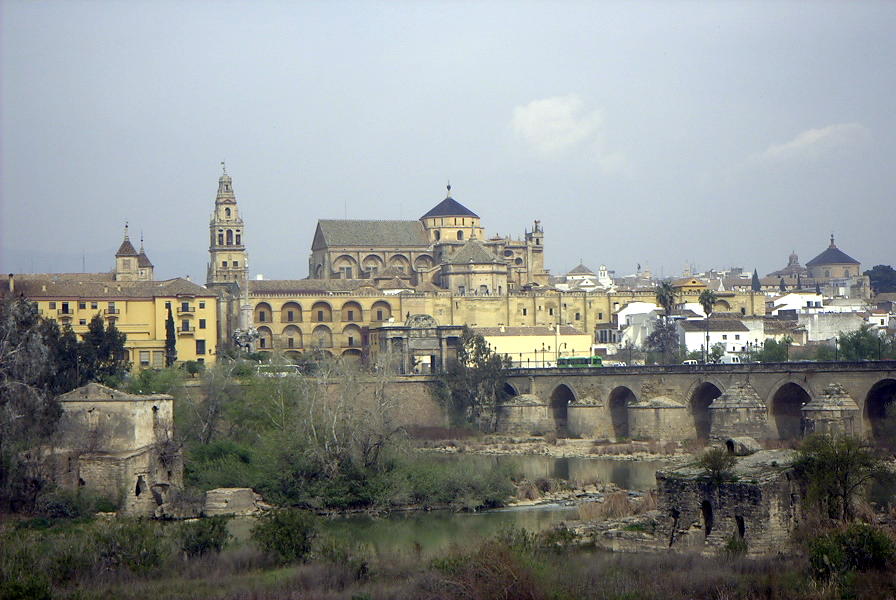 写真はローマ橋からメスキータを望む。コルドバは紀元前2世紀頃にはローマの支配下で繁栄していた古都である。8世紀の初めに北アフリカからイスラムの進入を受け、13世紀にキリスト教の再征服を受けるまで、イスラム文化の支配下にあった。メスキータとはモスク(回教寺院)のことで、キリスト教の征服でカテドラル(大聖堂)にしたもので、2つの文化の混合が見られて面白い。ここまではイスラム教、ここからキリスト教と建物を増築したので類をみない面白い造りに成っている。 -