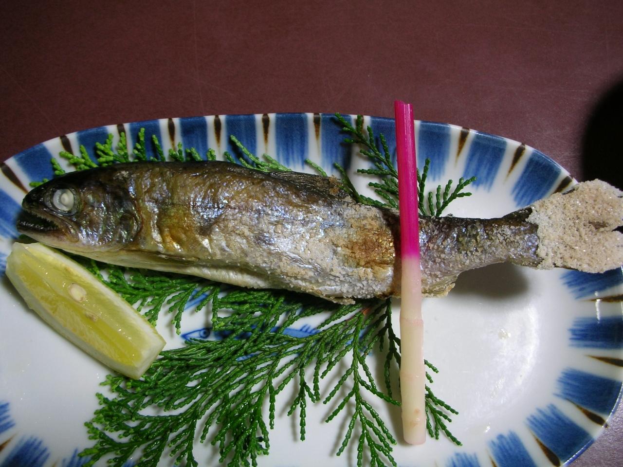焼き物〜山女魚の塩焼き。(駐車場の後ろの小屋のいけすに沢山泳いでました)