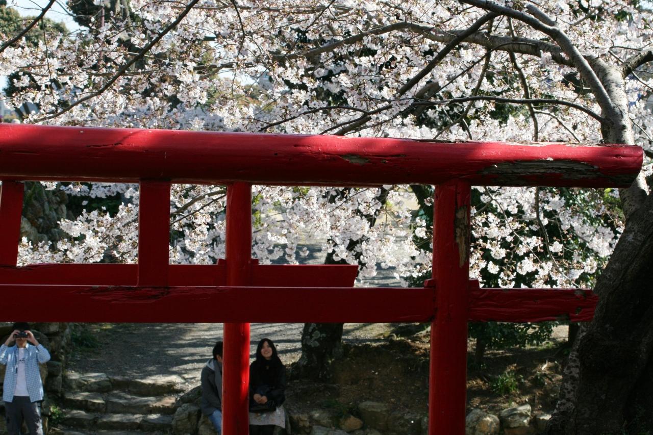 模擬天守の石垣の傍らにあった、赤い鳥居の光景です。『白龍神伏見太郎稲荷』の鳥居でした。ソメイヨシノの後継種と考えられているのが、1991年に新品種として登録された、『ジンダイアケボノ(神代曙)』です。公益財団法人日本花の会では2009年からソメイヨシノに替えて、天狗巣病に強く、花がソメイヨシノに類似するジンダイアケボノへの植替えを推奨しています。