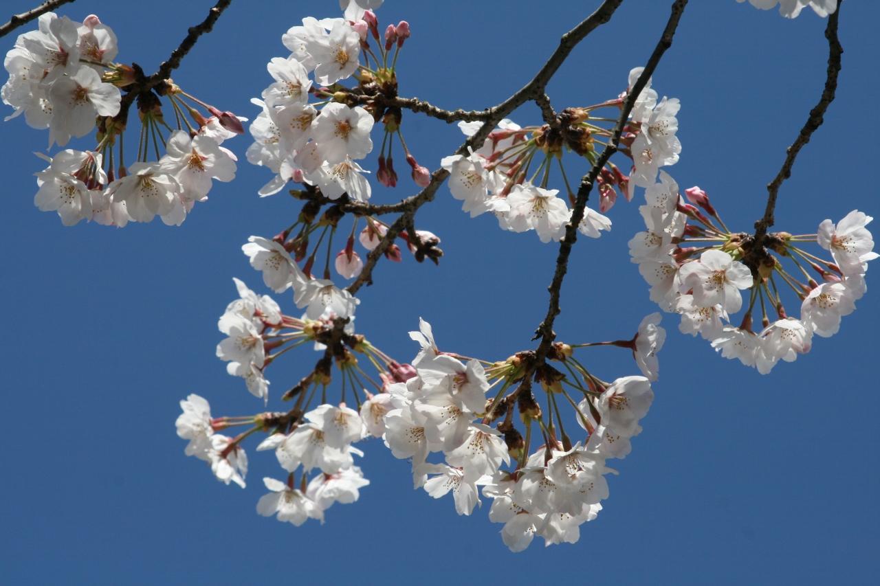 雲一つない青空をバックにした、満開のソメイヨシノの光景です。花の白さが引き立てられたようです。平成19年(2007年)3月、千葉大学の中村郁郎氏、静岡大学の太田智氏などの研究グループは、ソメイヨシノが『コマツオトメのようなエドヒガン系品種を母親に、オオシマザクラを父親として起源したことを示唆している』と研究発表しました。