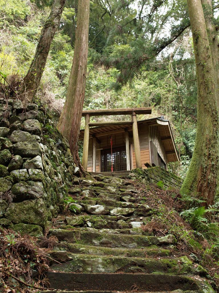 不動の滝の左側にこの社があります。ここのミツバチの巣が荒らされたのが熊出没騒動の原因です。
