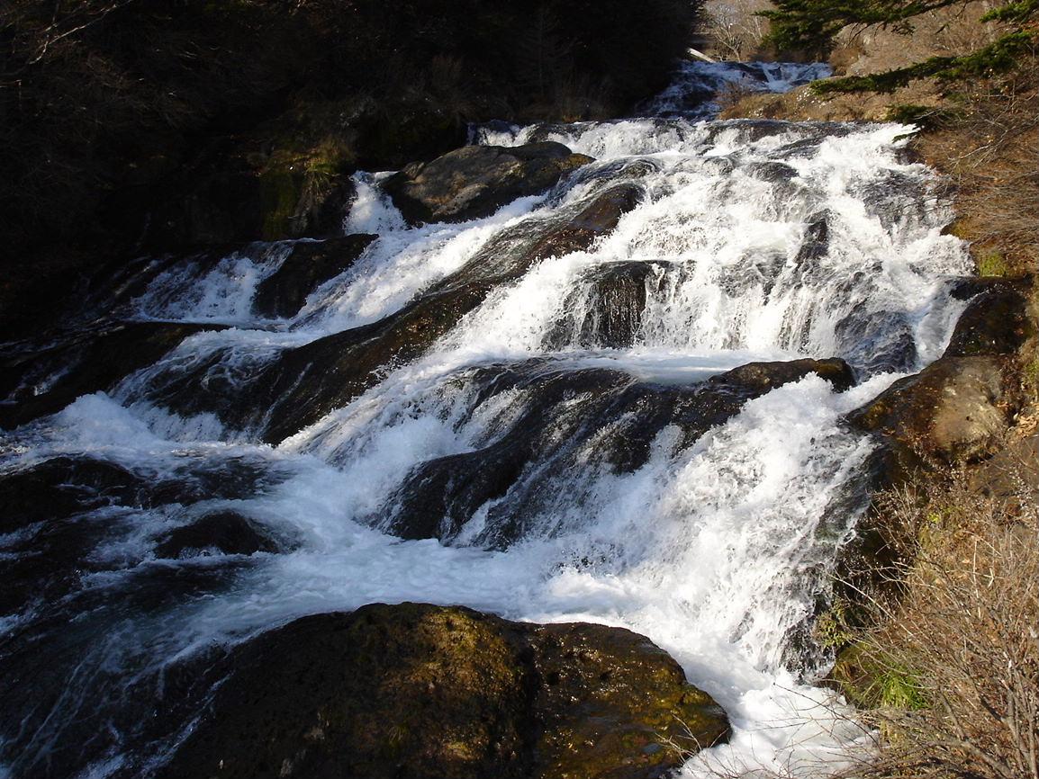 竜頭の滝です。湯ノ湖から流れ出た湯川が、中禅寺湖に注ぐ手前にあります。奥日光三名瀑のひとつで、男体山噴火による溶岩の上を210メートルにわたって流れ落ちています。滝壷近くが大きな岩によって二分され、その様子が竜の頭に似ていることからこの名がついたといわれています。