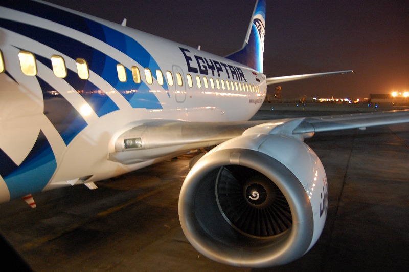 3時に朝食をとって空港へ。今日はアスワンとアブシンベルに行きます。エジプト航空の国内線は成田から来た国際線よりも小さい飛行機です。ホルスのロゴもデザインが違います。まだ暗いうちにカイロを飛び立ちます。 -