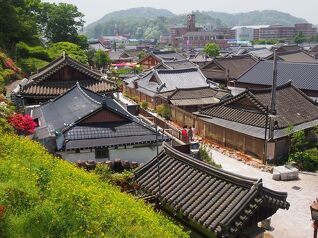 キョンジュの市街地。キョンジュは人口30万人を超える都会で、駅近くの通りには多くの店が立ち並んでいます。