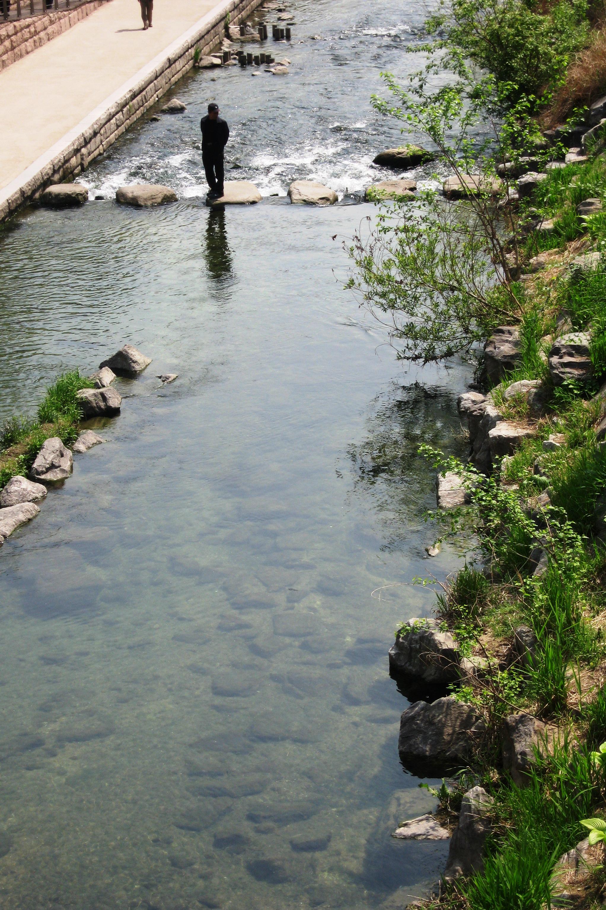 清渓川の清流のアップです。石垣の護岸だけでなく、自然を残した護岸で魚等も住むようになったようです。そのフォローの資料を目にしたことがあります。