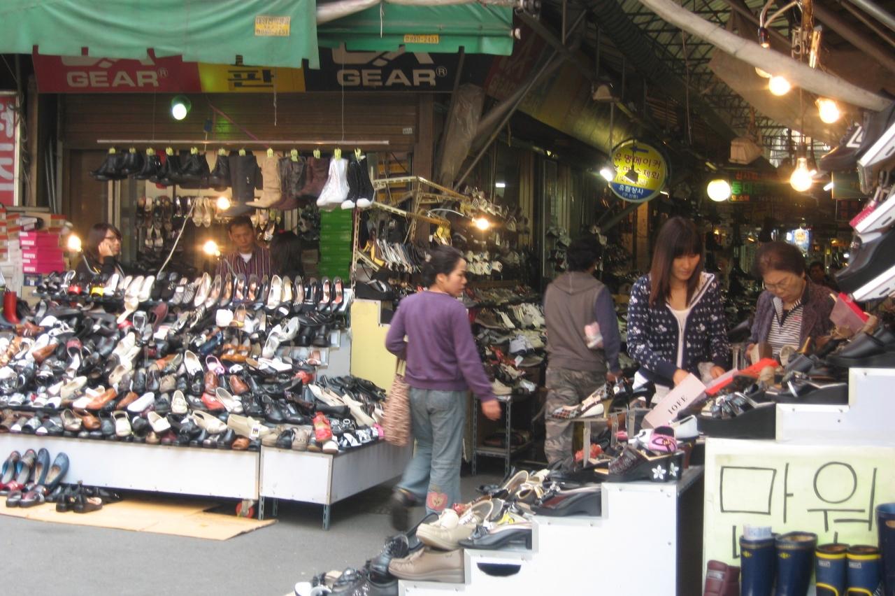 先ほど通った東大門の清渓川沿いの市場は、衣料品が主体でしたが、東大門の地下鉄駅近くは靴屋さんが軒を並べています。その一角です。
