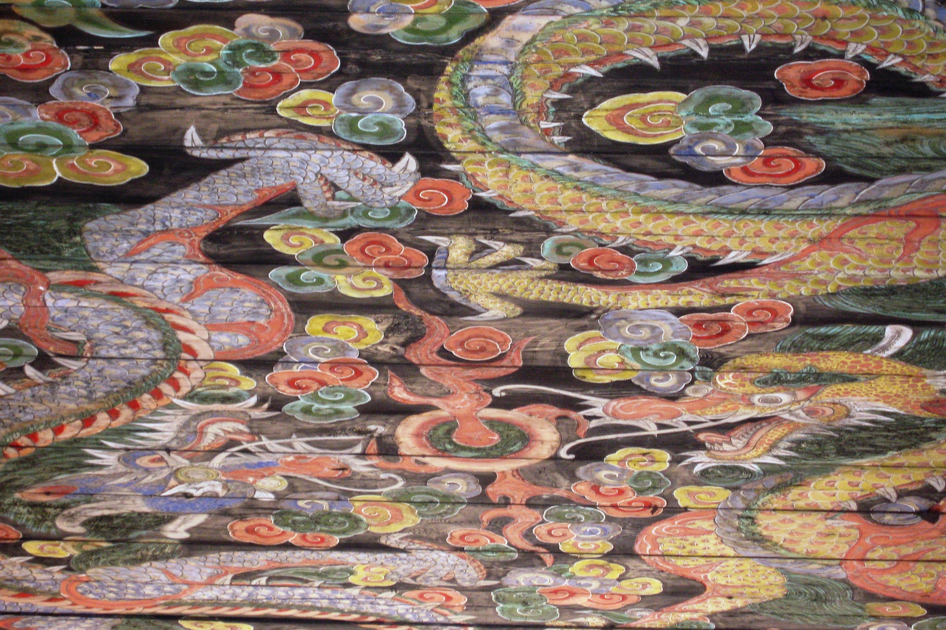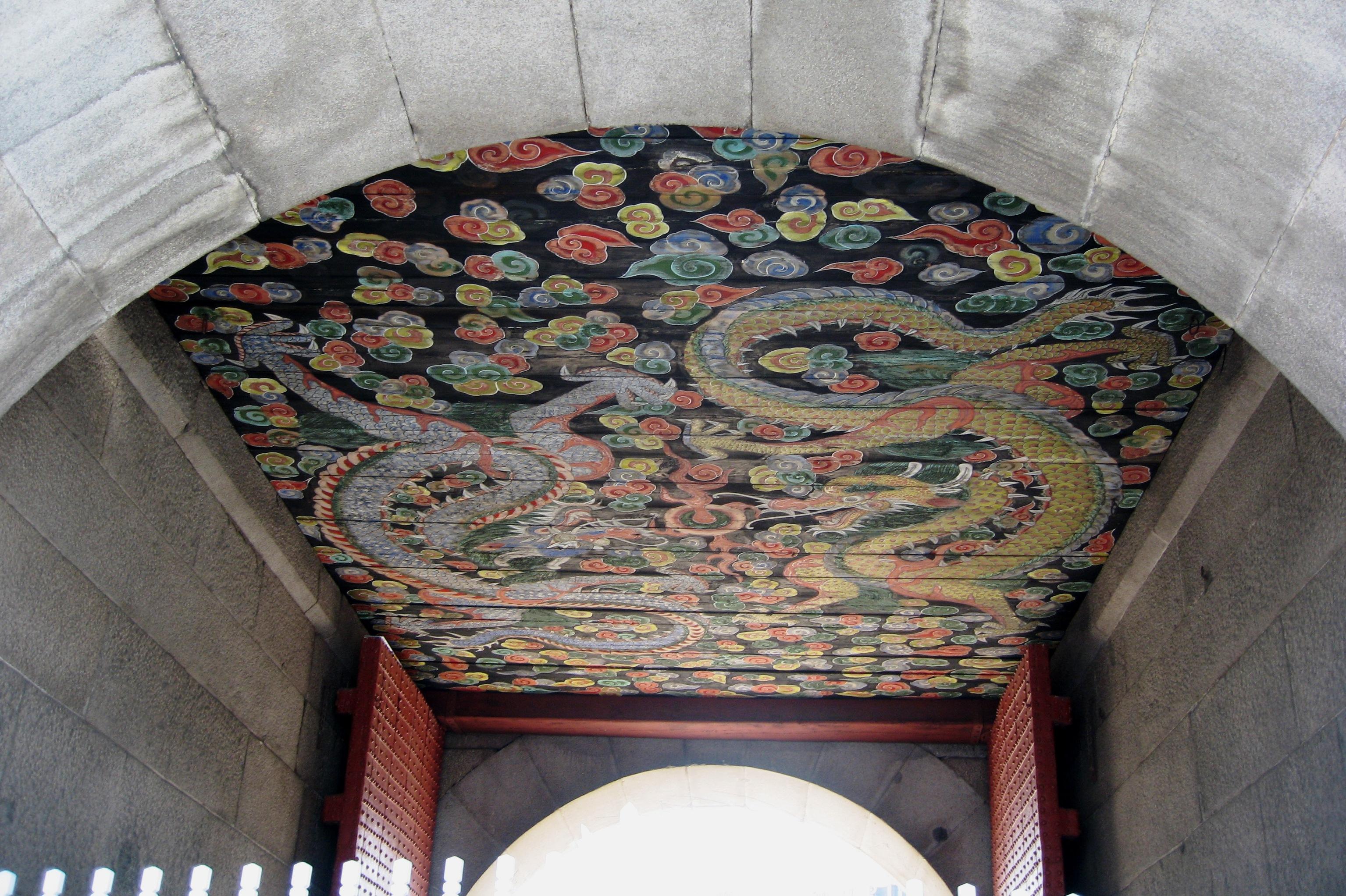 以前は近くに立ち入ることが困難でしたが、今は門のそばから見学できます。アーチ門の天井に描かれた雲龍です。