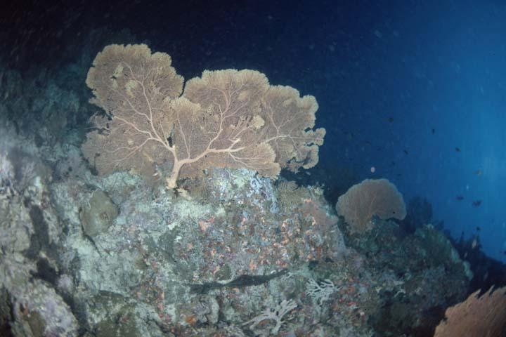 今日も少し天気が悪いが昨日ほどではない。オーストラリア組みは昨日までだったらしく今日からは日本人2人だけになる。またガイドが昨日までのマリオからリセナンの主人に交代です。今回のポイントはHelmot’s ReefでAlbatrossの次にいいポイントということで期待してエントリーします。-10msくらいのところに隠れ根がありドロップオフから-40m位のところまで一気に落ちている。最初にウォールを右に進む透明度は悪く、時々グレーリーフやサワラが通りすぎてゆく。透明度が悪いのでなかなか写真を取れる範囲まで近づけない。エーアーが半分になったところでリーフ上でサンゴを撮りながらアンカーのところまで戻る。最後にアンカーのところで時間をつぶしていたが、そこにウミシダが1つあったがなにやらそいつがもぞもぞしている。じっくり眺めていると、足をばたつかせて隣のサンゴに移動しようとしている。その時に腕で隣のサンゴの位置を確かめて体を支えつつ足を使ってやはり隣のサンゴをたしかめながら移動している。見る見るうちに30cmほど移動してしまった。こんなに元気なウミシダは始めて見た。 -