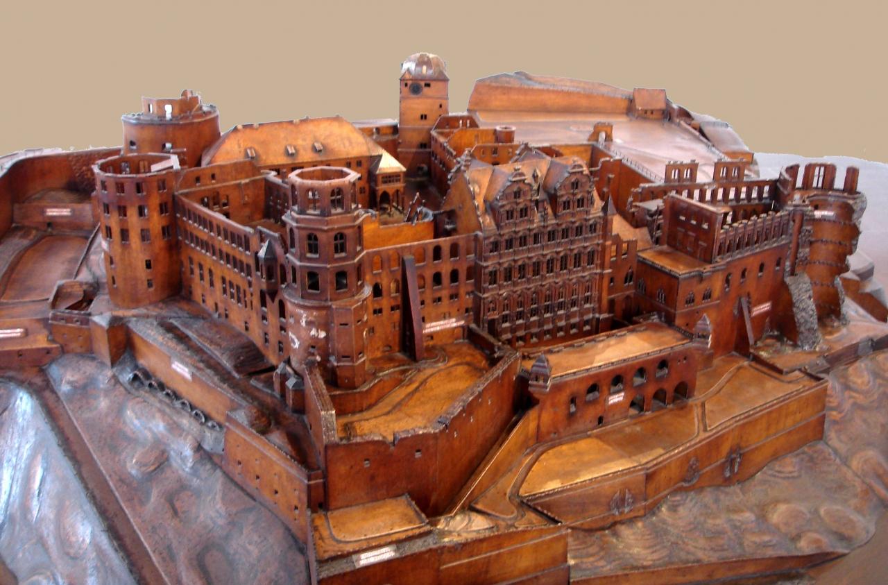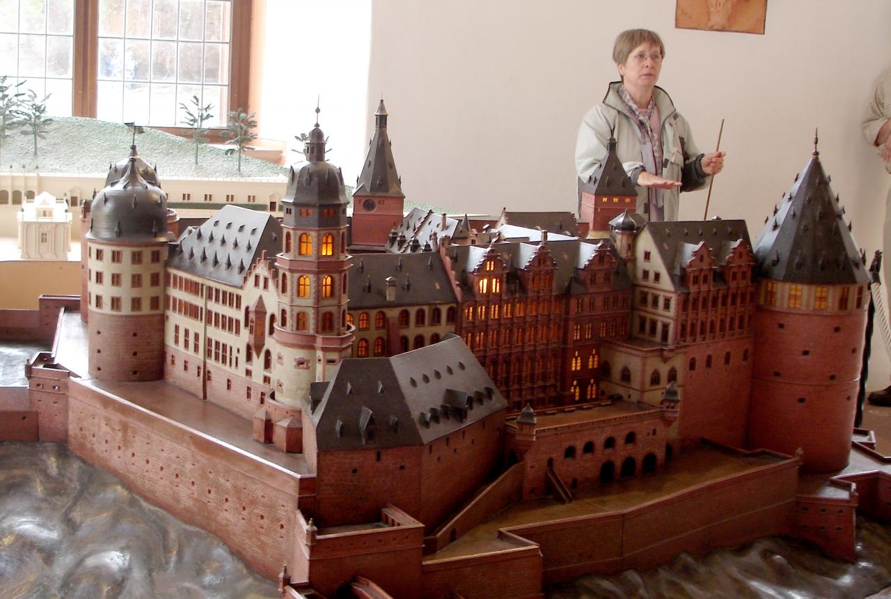 1689年以前(破壊される前)のお城のモデル の前で説明するガイドさん。