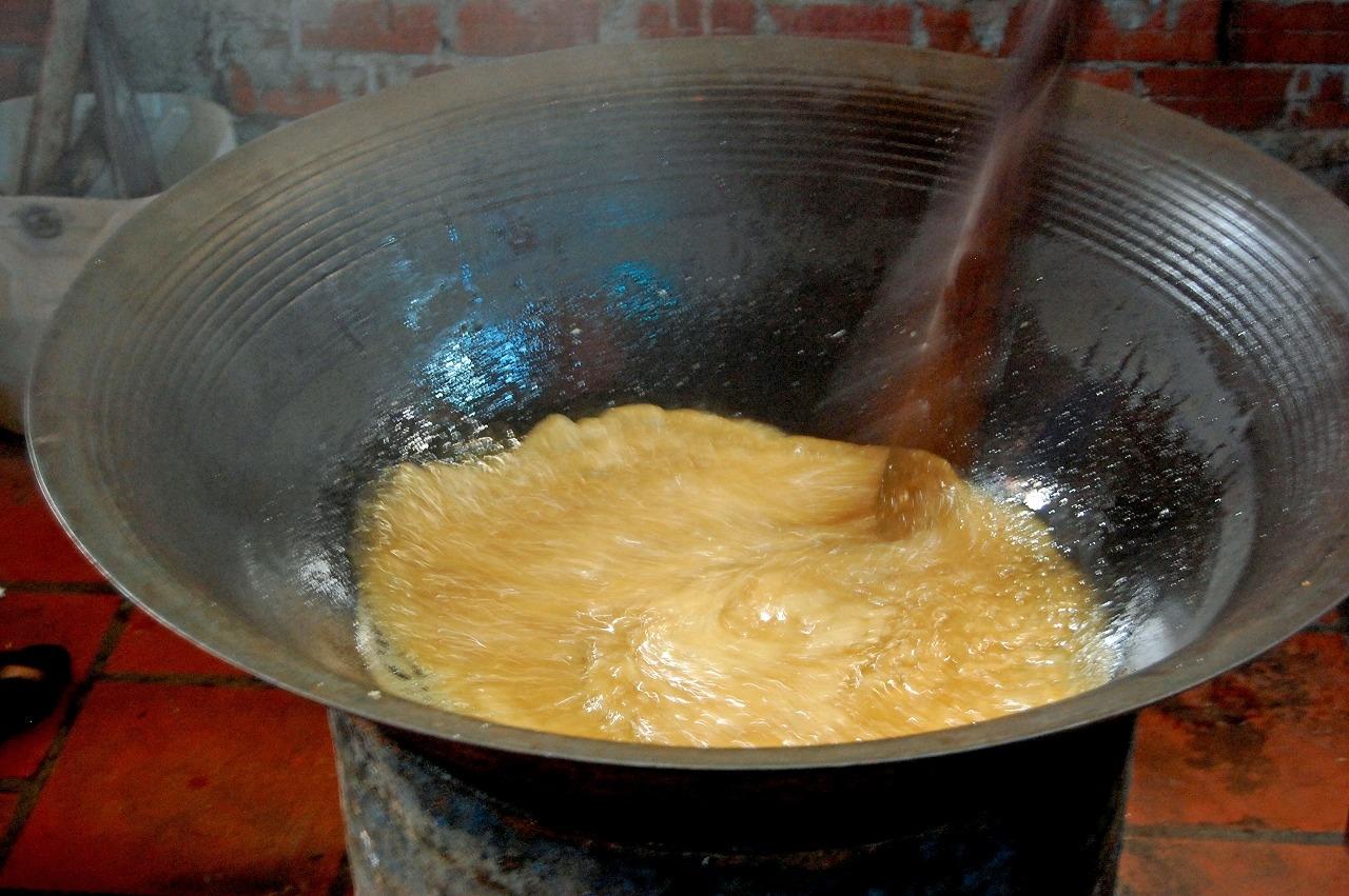 ココナッツの実のスライスと黒砂糖を火にかけていきます。