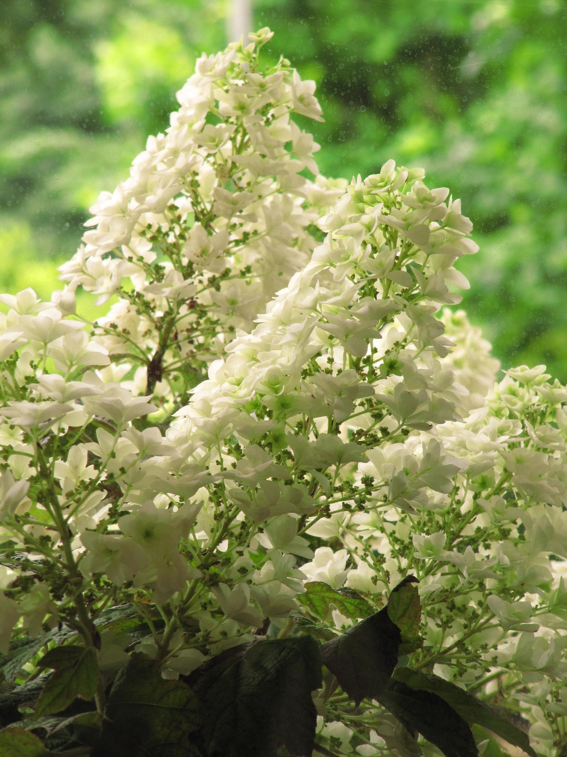管理棟のガラス窓の内側から撮ったカシワバアジサイ