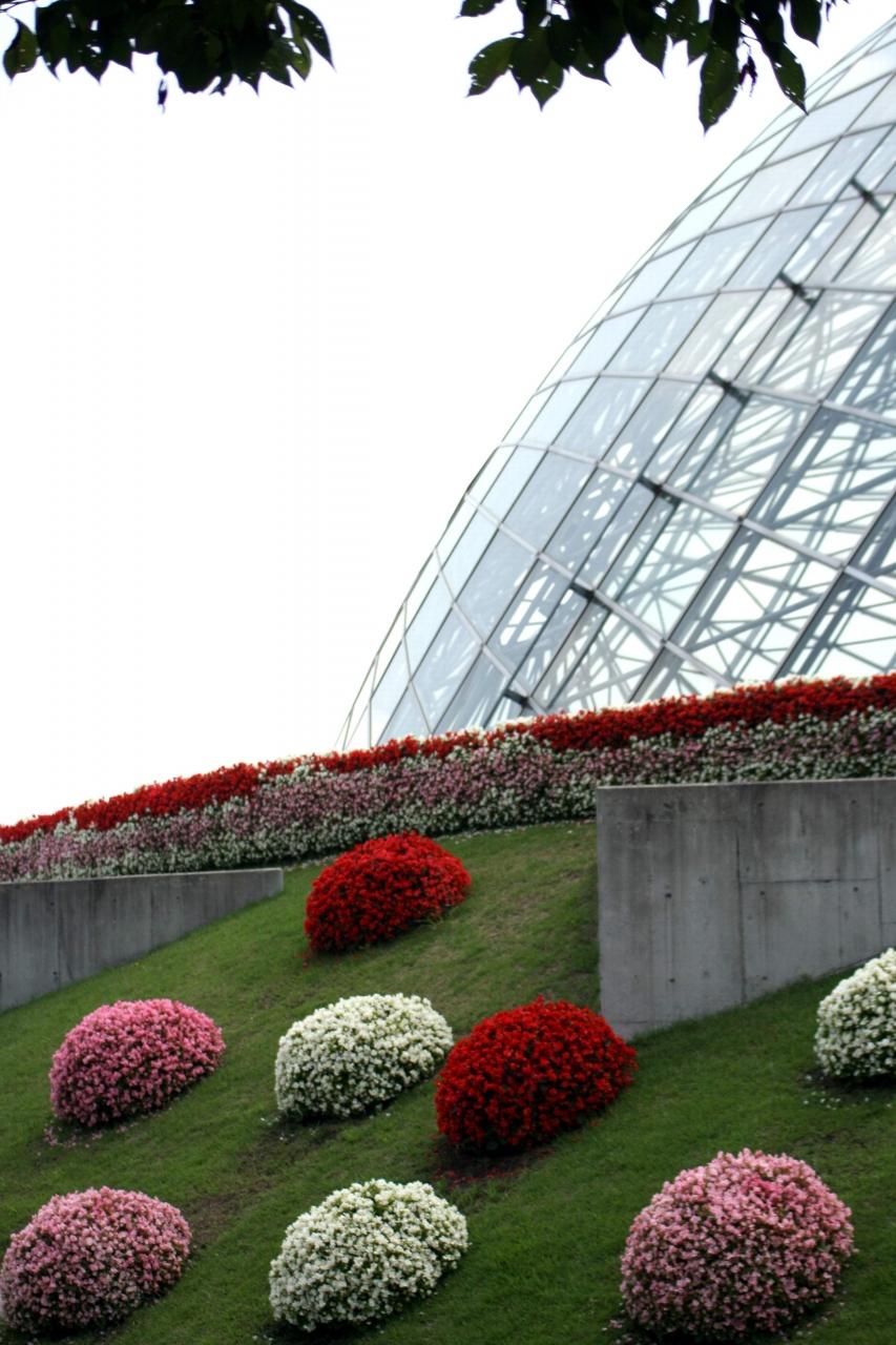 フラワードームは、園内中央、直径50m、高さ21mの巨大なガラス温室です。 -