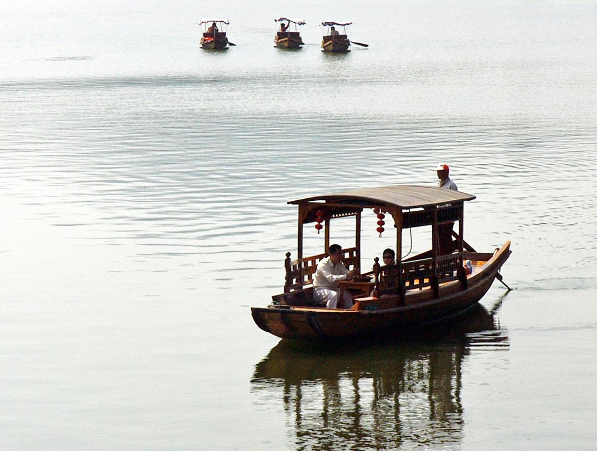 西湖のほぼ三分の二は歩いたので、ここらで船に乗ることにしました。湖の中の島を巡ってホテル方面へ戻れればもう歩かなくても良いからです。倣古船は45元と普通の船より10元高いのですが、その分空いていました。