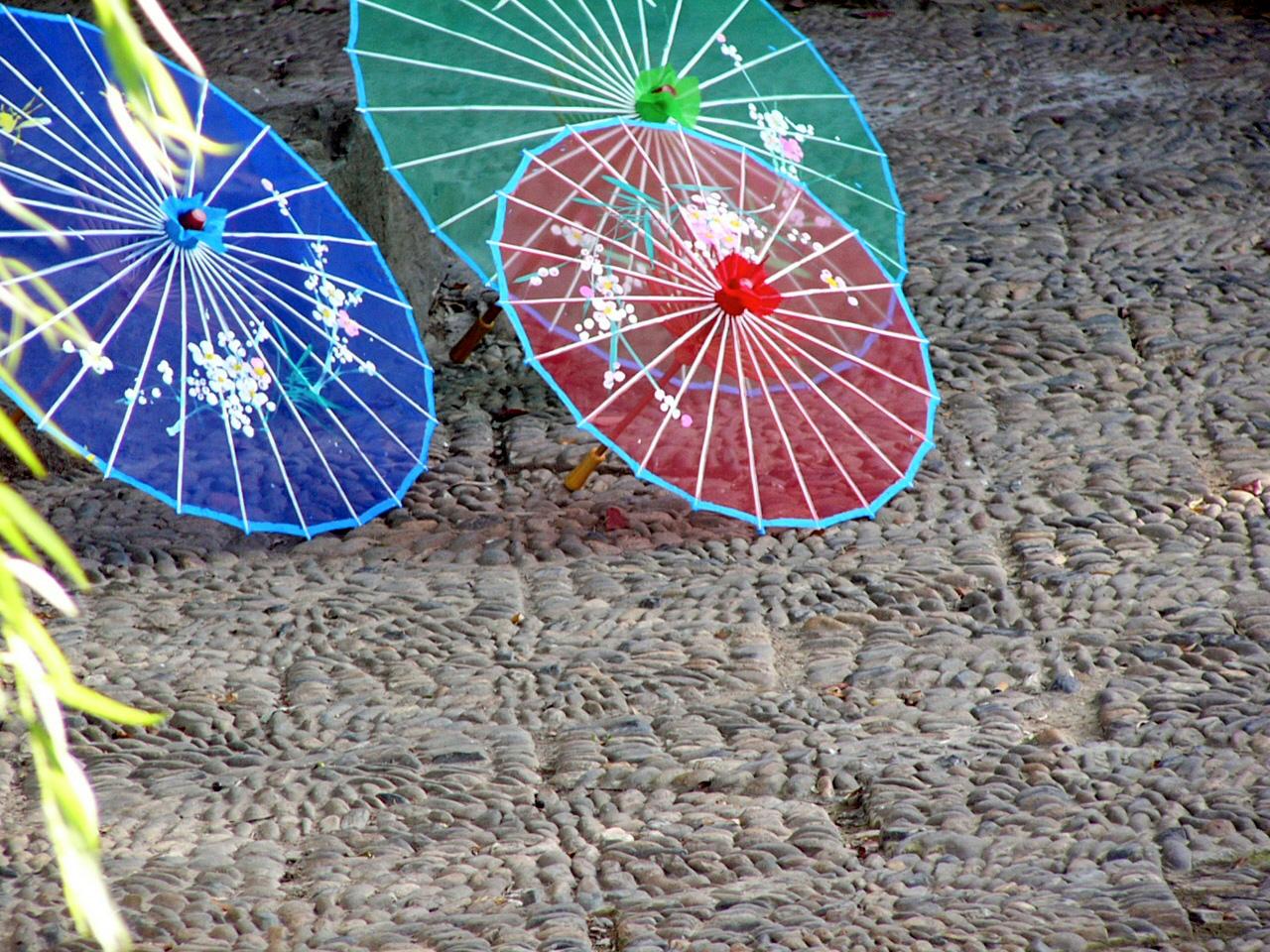 お土産物屋さんの前に並べられた日傘がきれいでした。思わず買いたくなるほどです。
