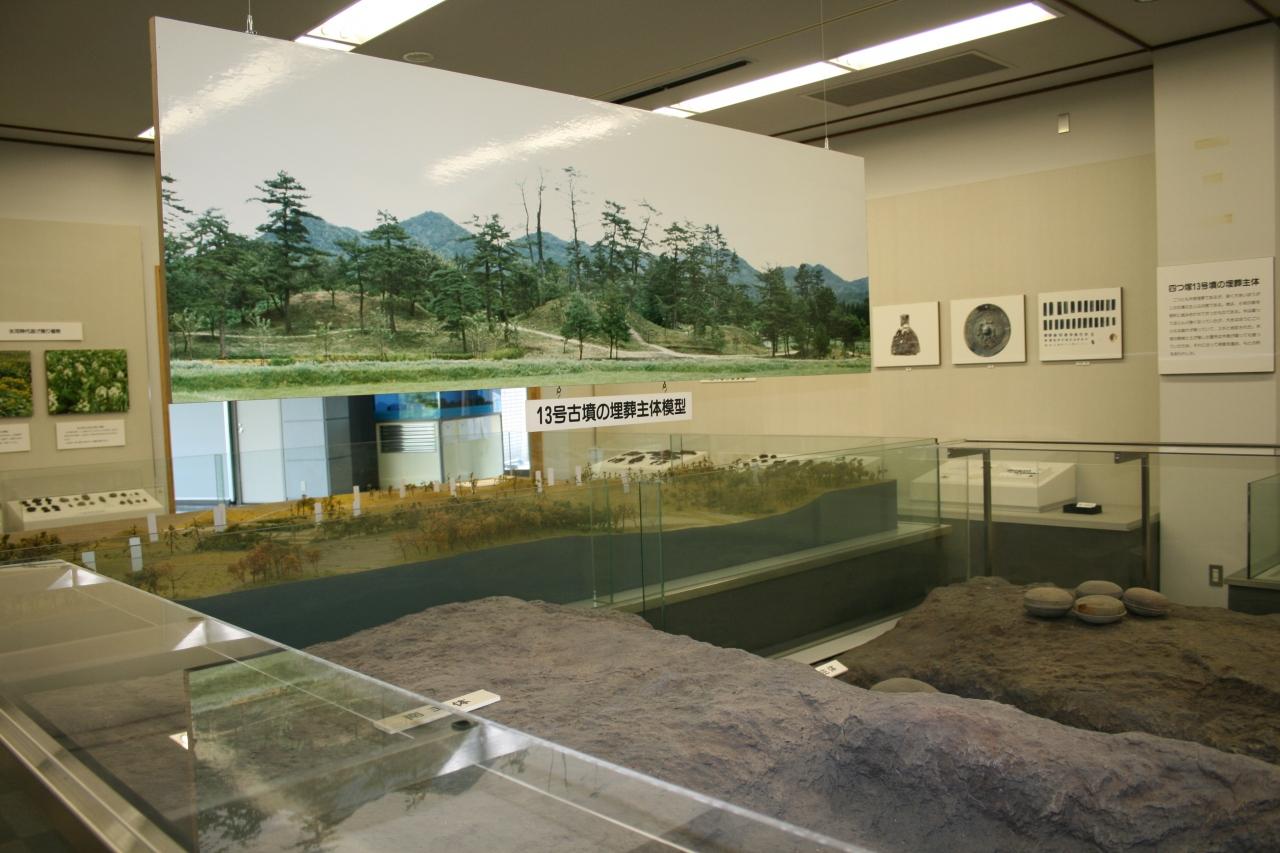 四つ塚古墳群の出土遺物を中心に四つ塚古墳群の全体模型、13号墳の埋葬主体の実物大復元などの展示を行っています。 -