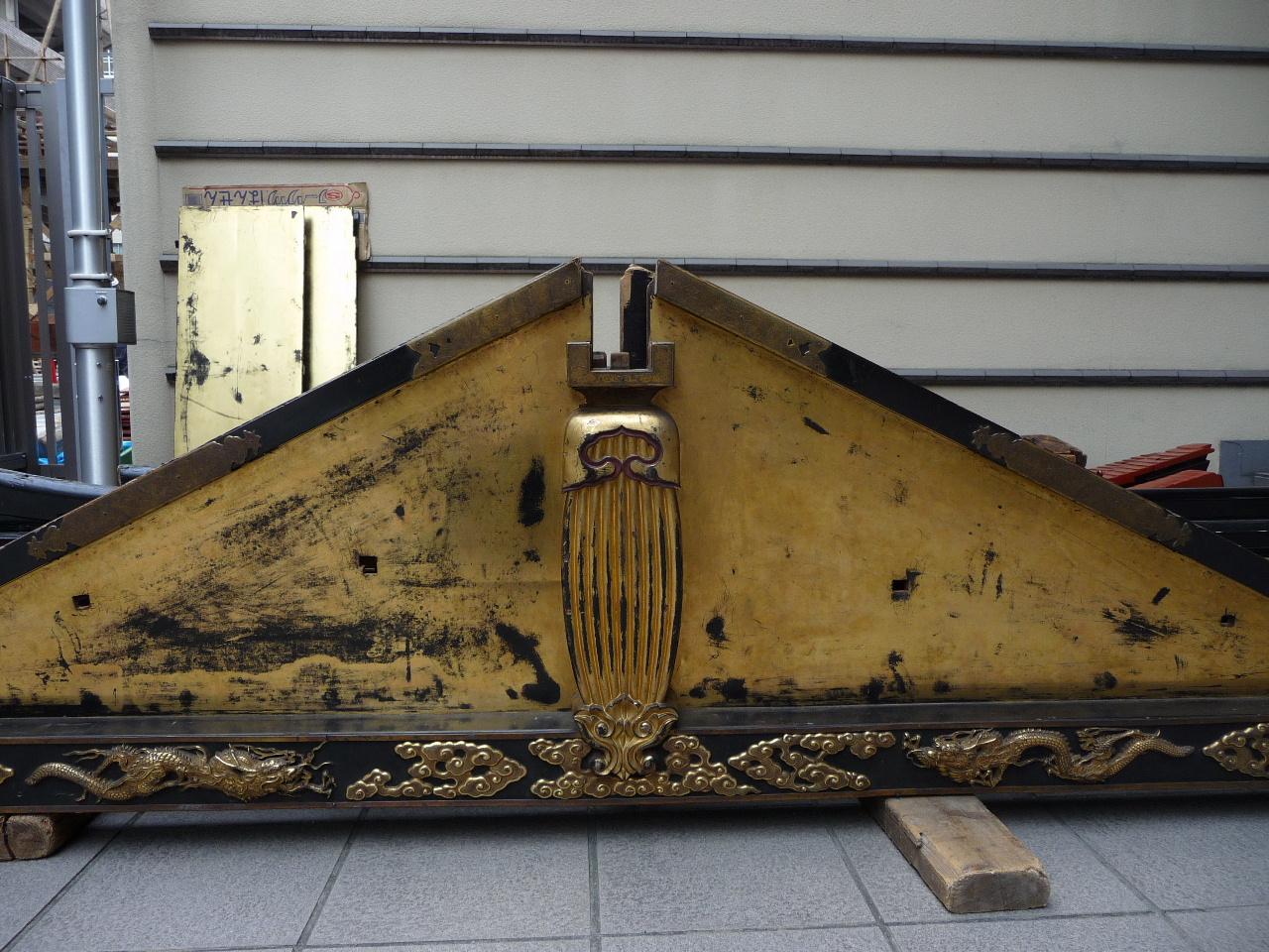 屋根を運んでいます。レンガ色に見えているのは滑り止めです。大屋根の上に舵取りが乗らはりますので滑り止めが付いています。