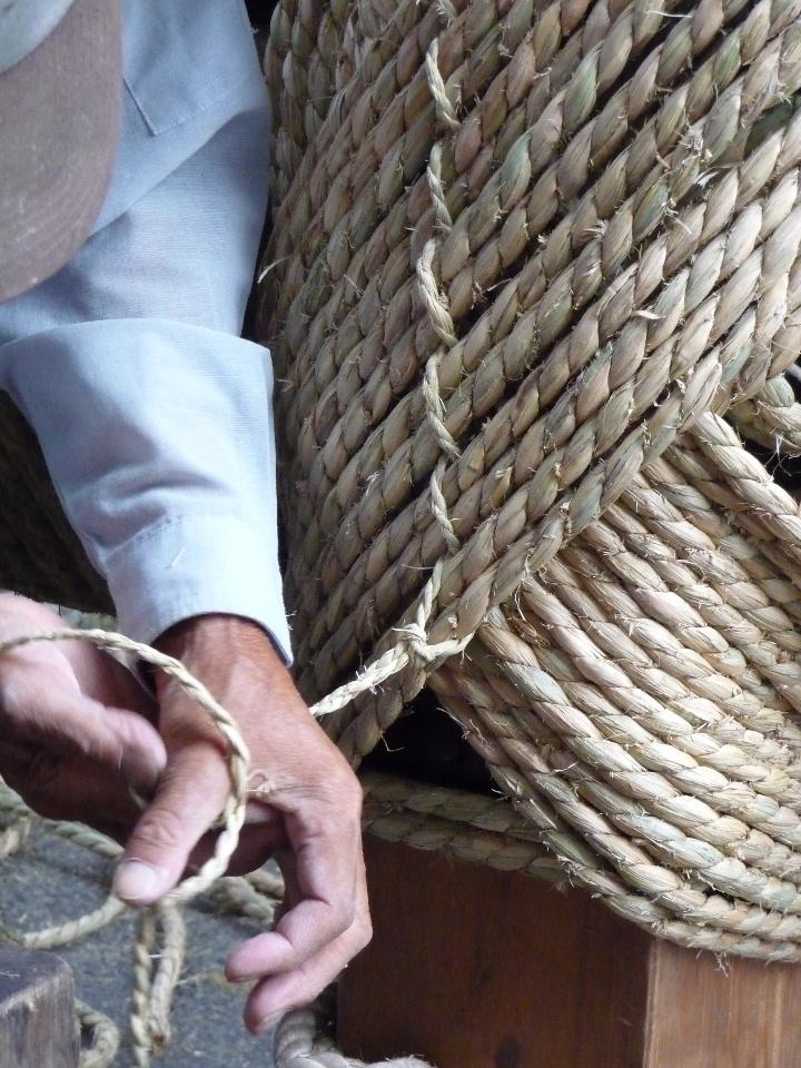 金属製のひっかけ(オレンジ色)に縄を通して下の縄をすくっていきます。すごく力がいるようです。