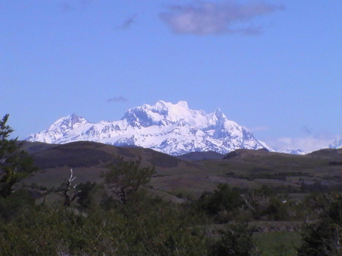 トレッキングコースの終点から望む公園の最高峰・パイネ・グランデ。ラーゴ・グレイから見るよりかなり険しい表情だ。山の両端のピークの間には氷河も見えていた。