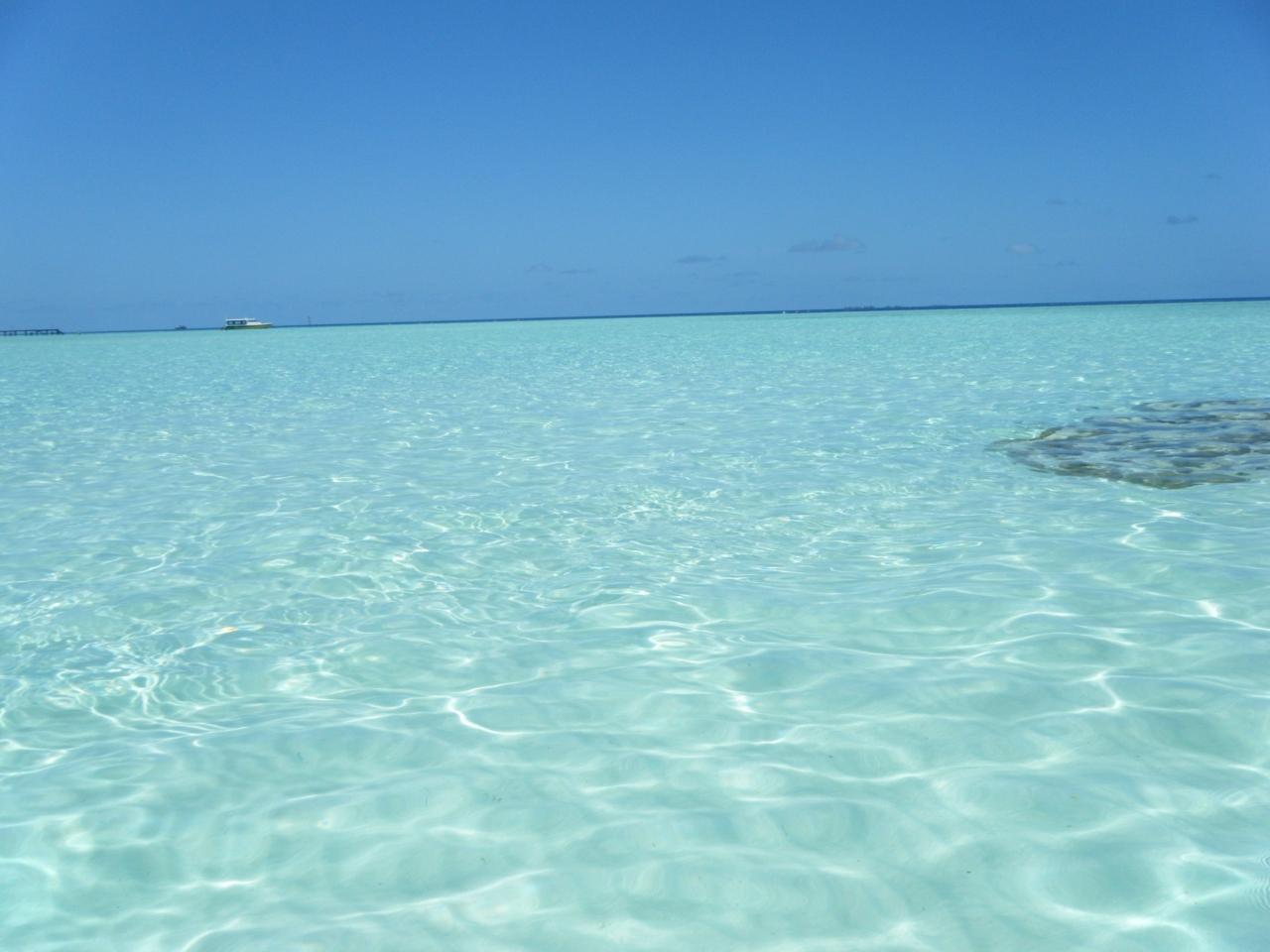 広い方のビーチ 引き潮の時は200m位 アクアマリンブルーの浅瀬が続きます。アタシ達は メイン桟橋のパッセージから入って この浅瀬から上がって 歩いて戻りました。