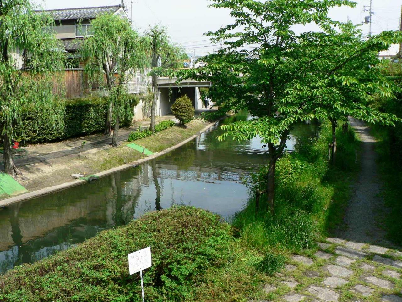 十石舟(じっこくぶね)が運航する濠川(ほりかわ−宇治川派流)の光景。十石舟は月桂冠大倉記念館裏の弁天橋から発着する。