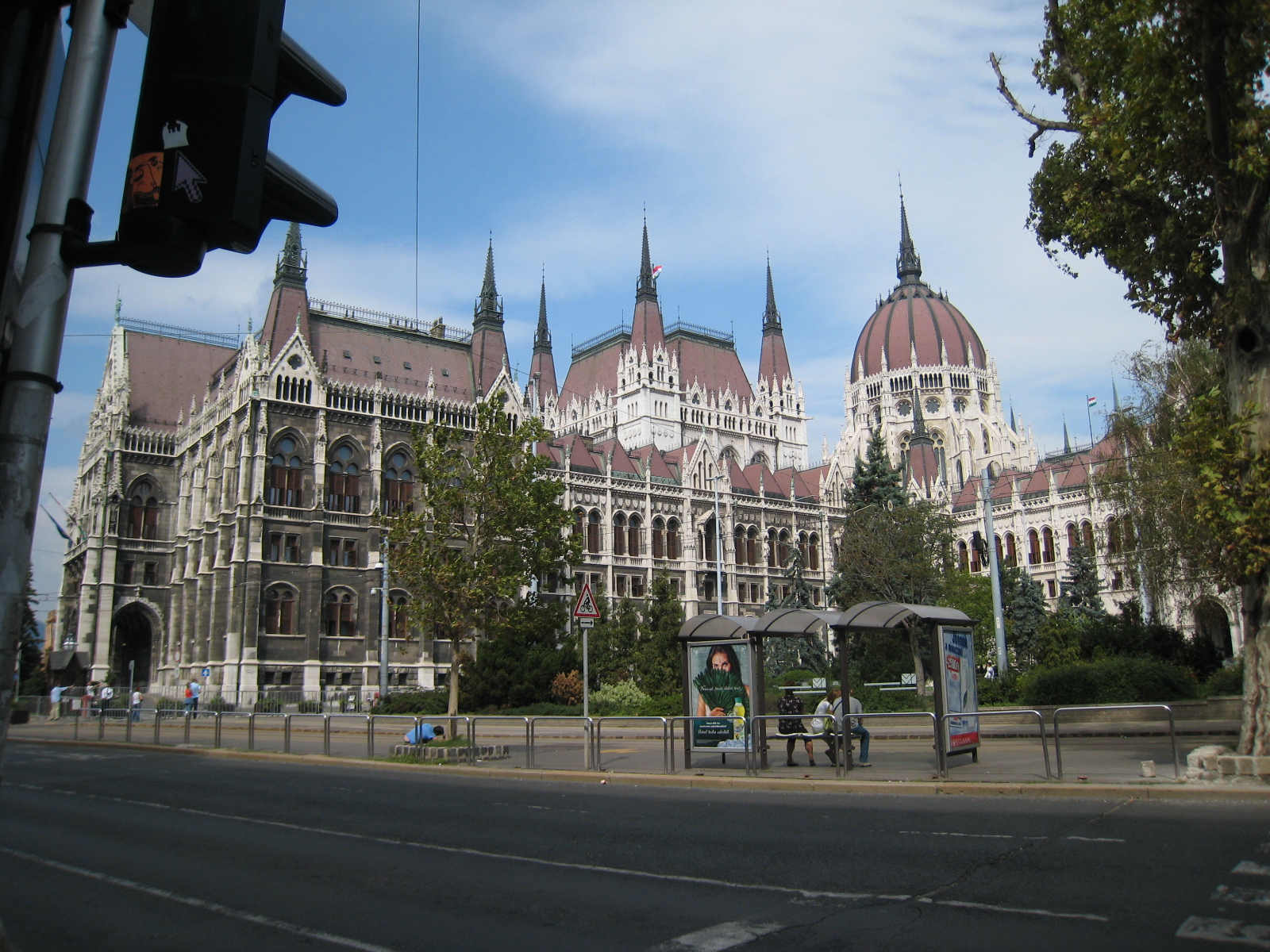 トラムの窓越しに撮った、ドナウ川と国会議事堂。