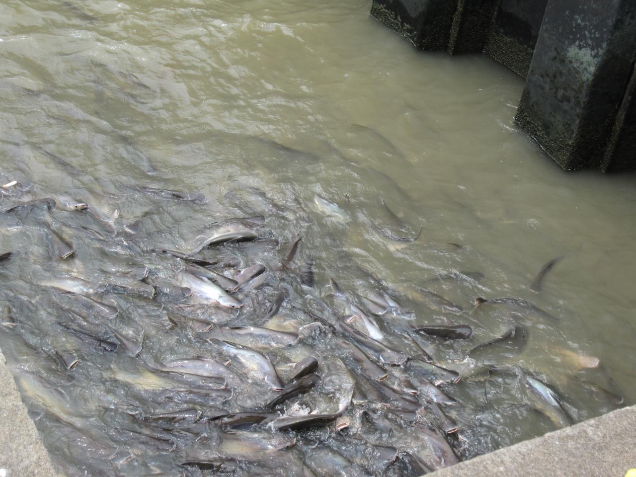 ワット・アルン側に着いたら、桟橋の下にナマズ(……ですよね?)がいっぱい!