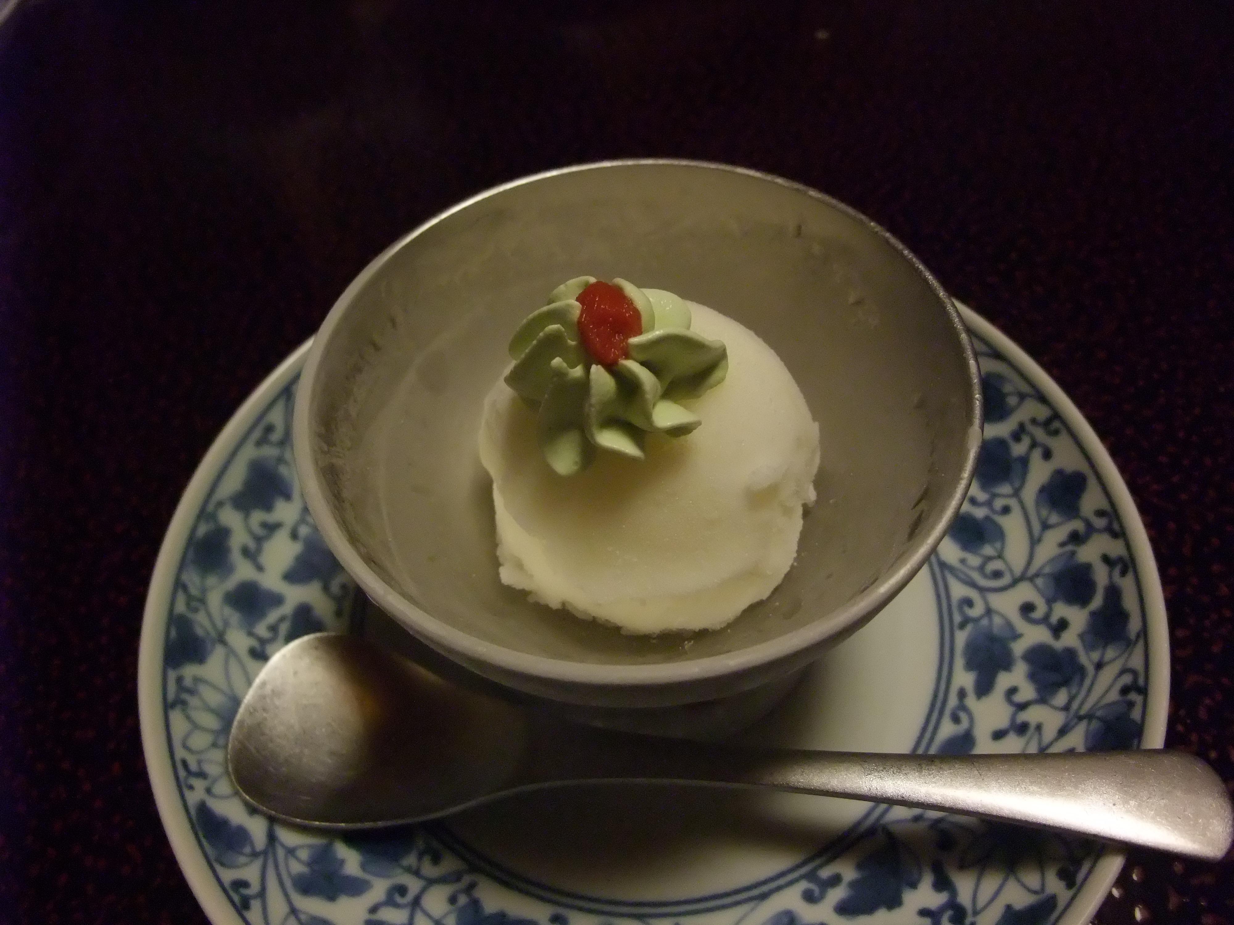最後にシャーベットでお終い。上に乗っているのはわさびか、さすがは長野だ、と思っていたら、普通に抹茶のクリームだった。そりゃそうだわな。
