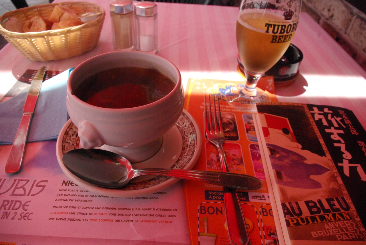 前菜のスープ、その後のステーキとフリッツ(ポテトフライ)を食べながら、ビールを飲みながら、