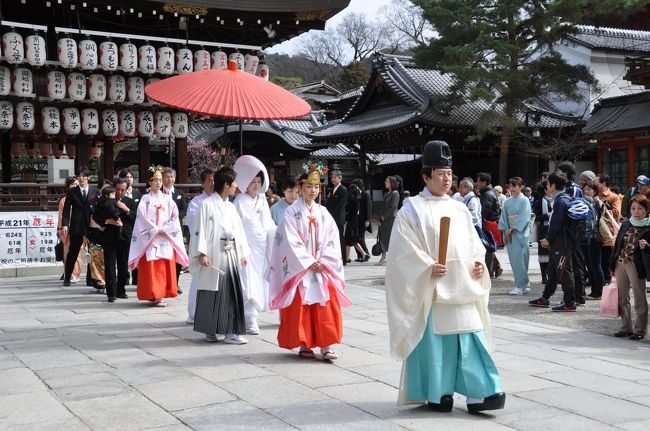 その京都は東山にある祇園祭で大変有名な八坂神社で、たまたま結婚式がありました。神殿から新郎新婦が社務所まで歩いてくる様子を撮影しました。