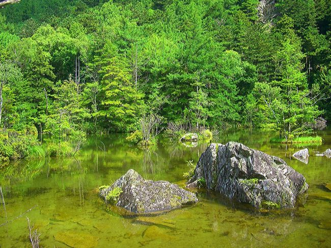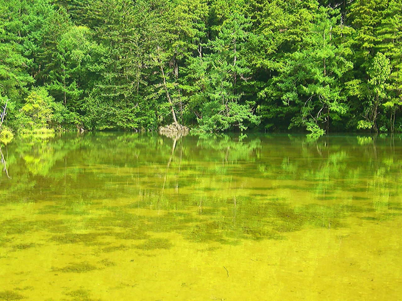 針葉樹に囲まれ荘厳な雰囲気を漂わせる明神池にはもともと池が3つありましたが、ひとつは土砂でふさがれ現在は2つとなりました。