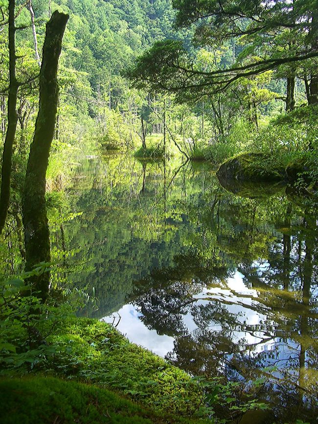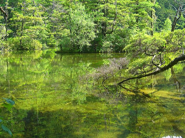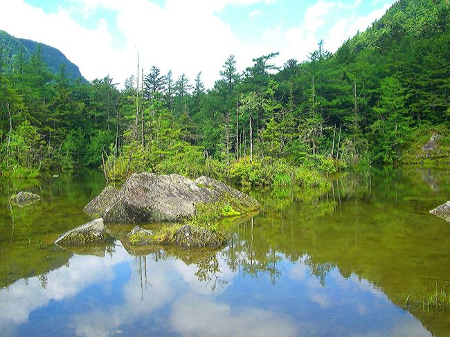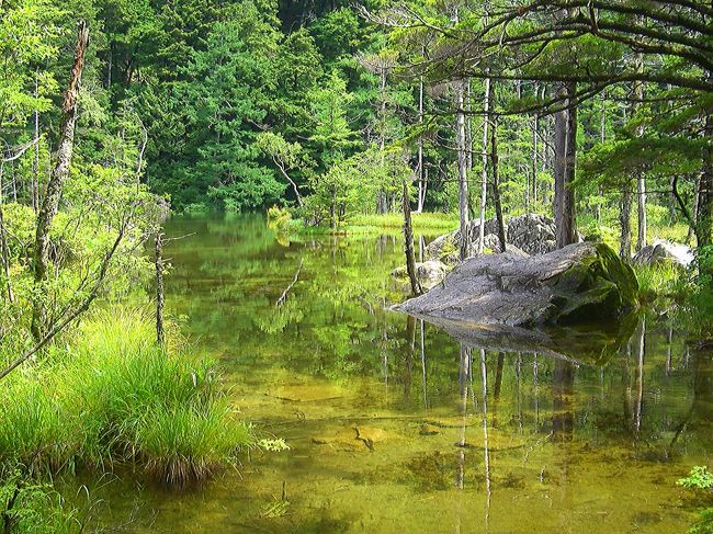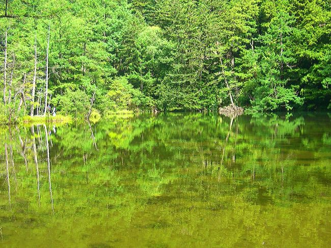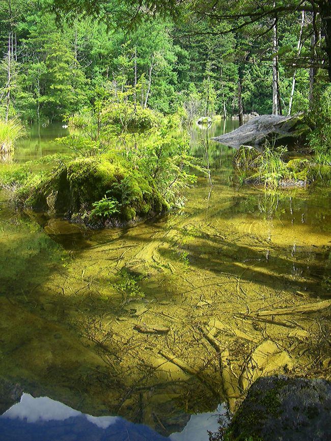 池は明神岳からの伏流水が常に湧き出ているため透明度が高く、湖面へ映る木々が美しく神秘的な感覚が味わえ、まさに上高地のミラーレイク、散策にはもってこいですね。