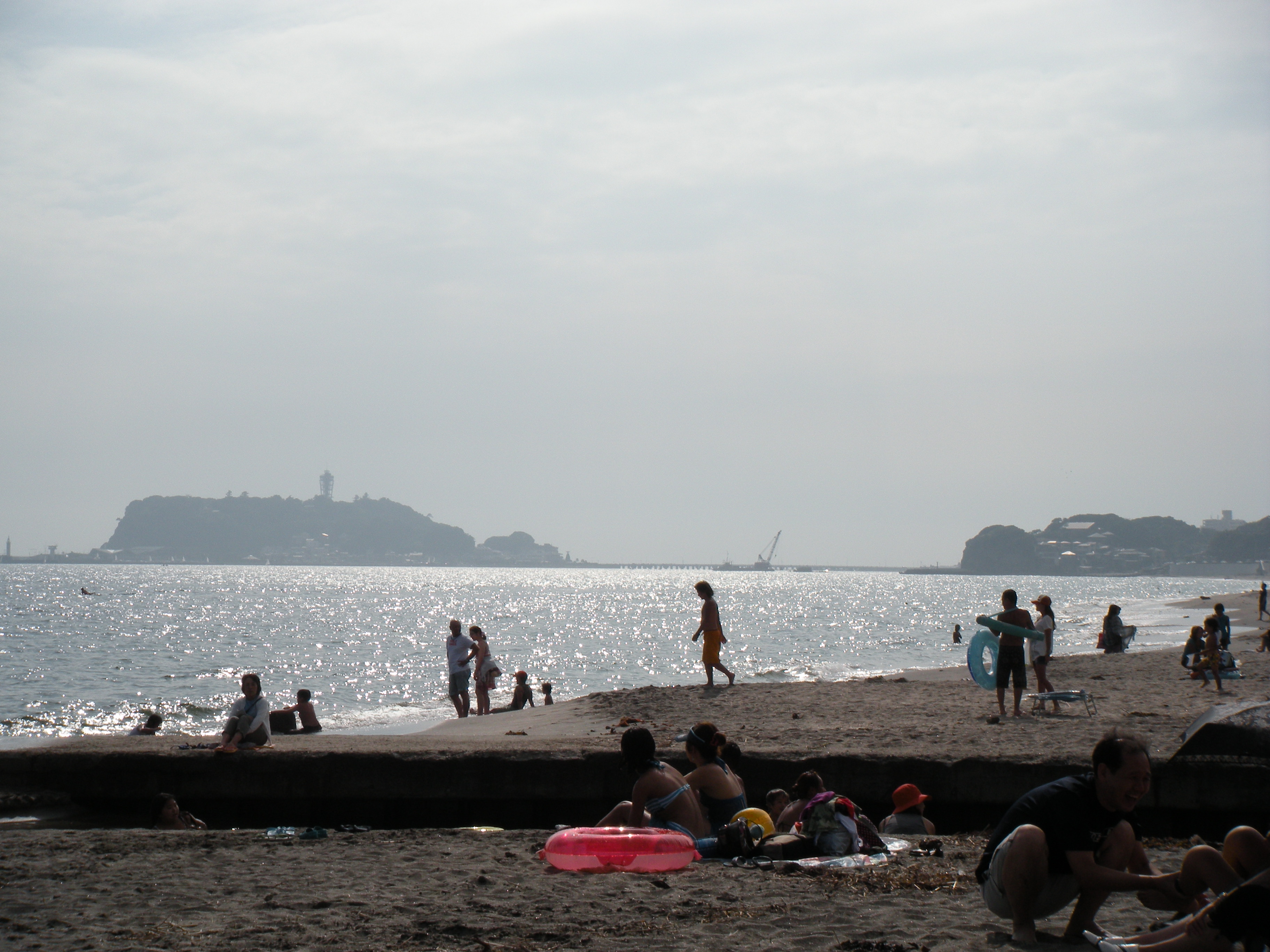 七里ヶ浜のビーチに座って、再びビール飲み飲みサンドイッチやらをつまんでいたら………。