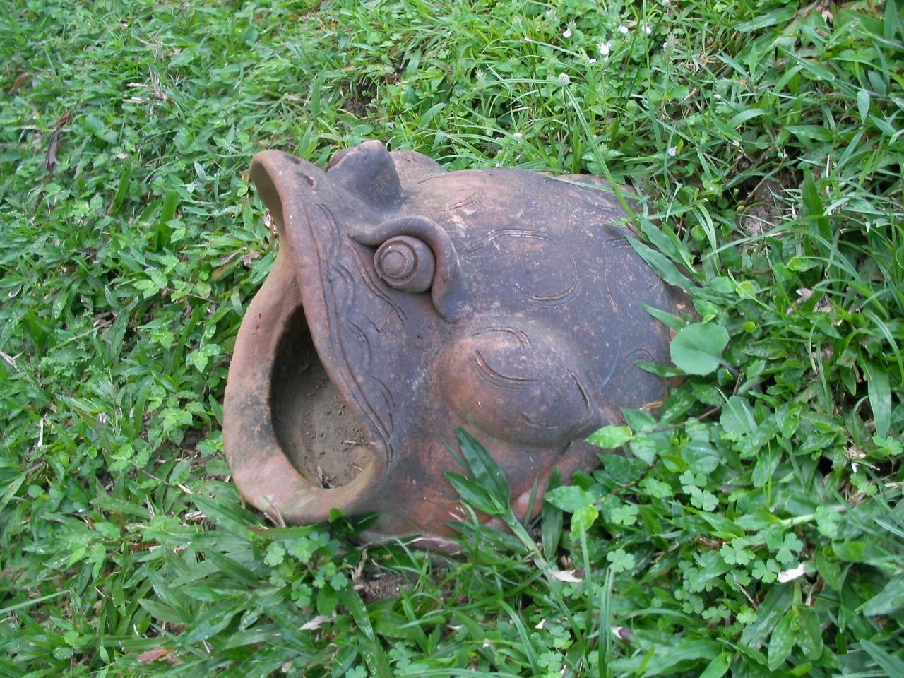 橋を渡った先、車寄せの手前にはこんな可愛い狛犬(?)が居ます。ちゃんと「あ・うん」になってます。(「ほ・いー」の方が近いって見えるけど)