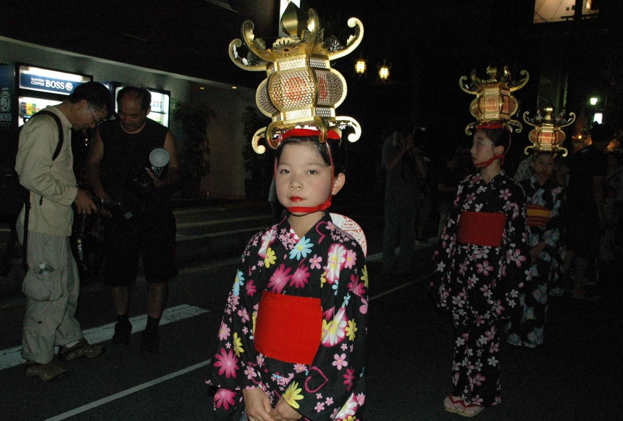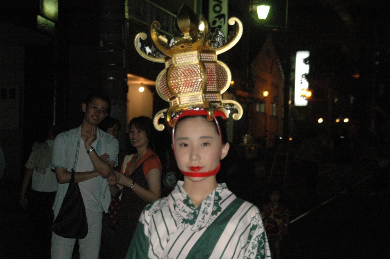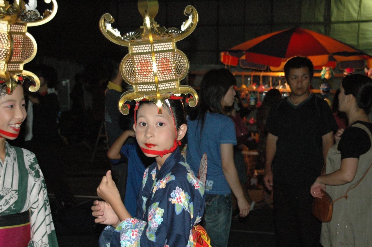 少女たちの山鹿灯篭踊り町流し。お祭り広場で。中学生が踊ります。