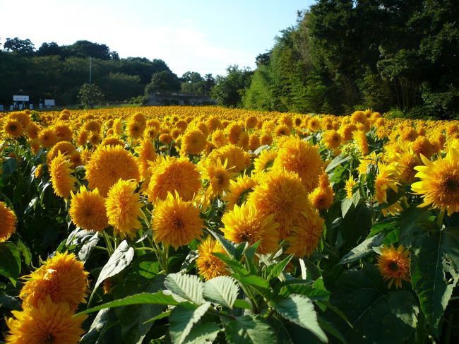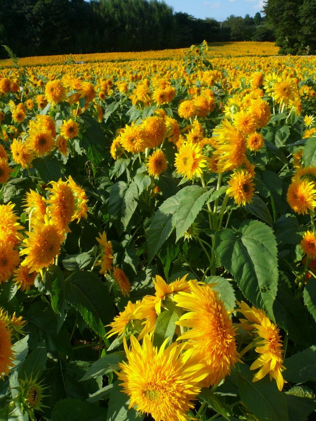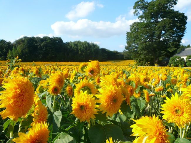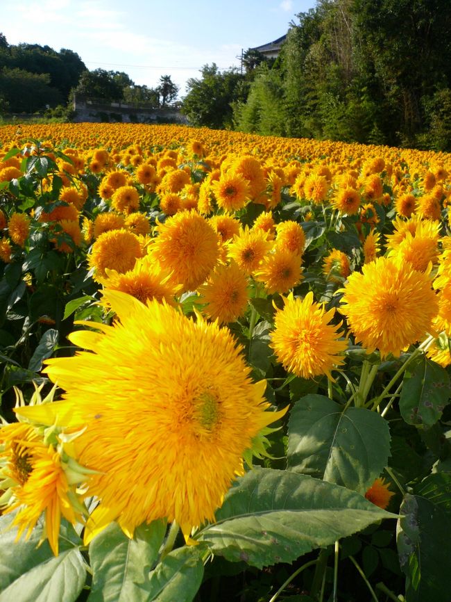 八重ひまわりが多く、普通のひまわりより咲くのが遅いため、8月末から9月初めあたりが見ごろでしょうか。