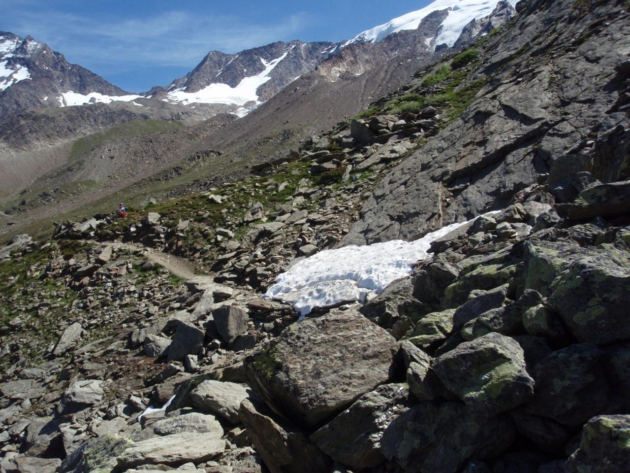 トリフトホルンの尾根をこえたあたりから見たサースフェーとミシャベル山群。視界がどんどん開けてくるあたりになります。