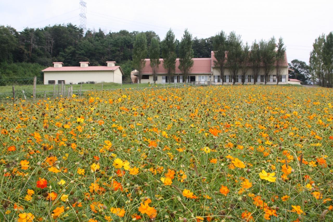 四季色々な花が楽しめます 今はキバナノコスモスです。希望により有料で花を摘み取ることができます。後方の建物は牛舎です。