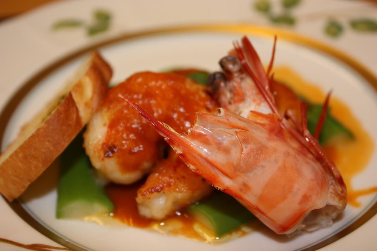 車海老、貝柱、アスパラ、海老ソース、パン。