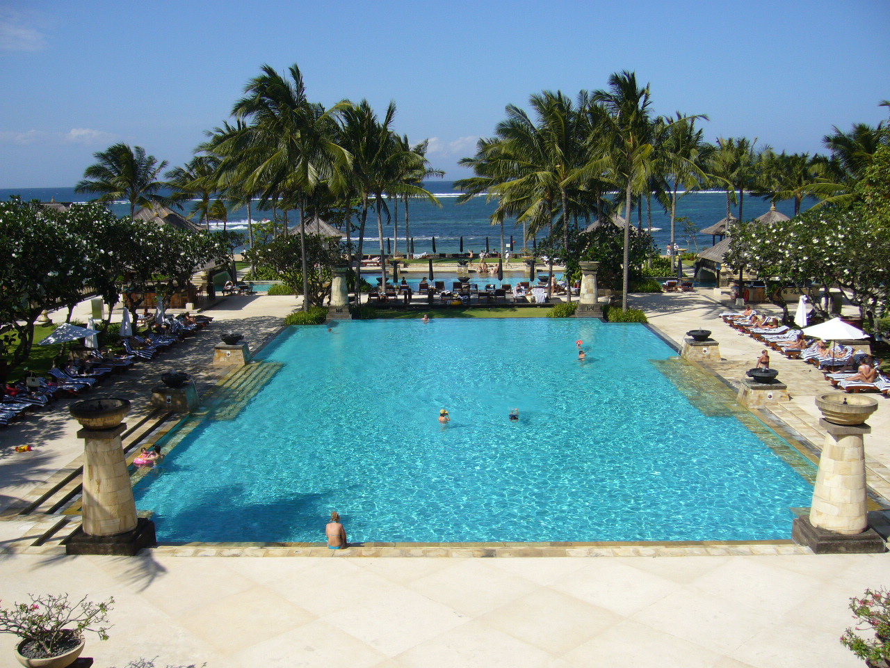 ホテルロビーから見下ろしたメインプール。さらに向こう側は海です。本当に開放感があって見ているだけで満足できます。