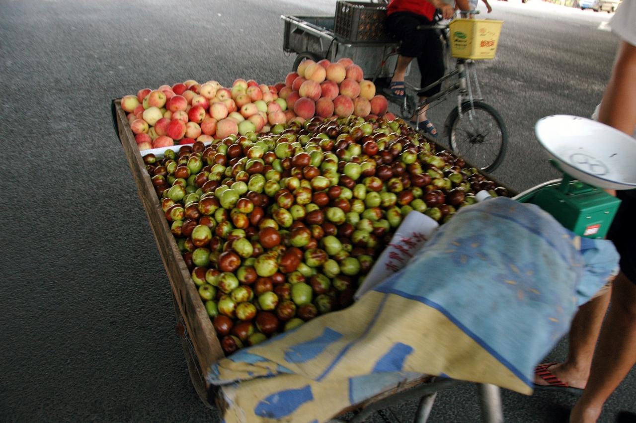 大通り(建国路)を渡っていると、分離帯のガード下に果物売りが居ました。