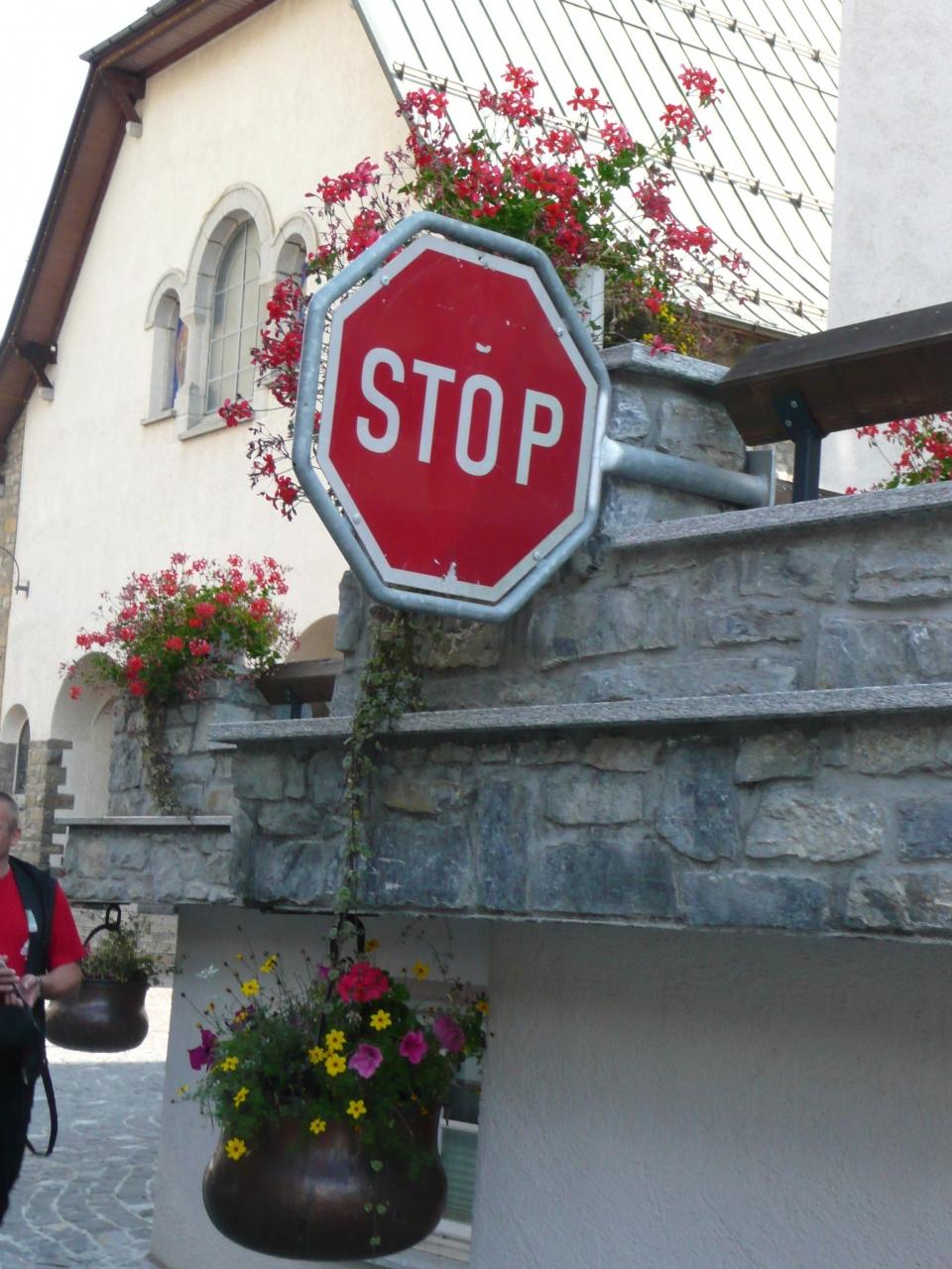 止まれの看板にもお花がぶらさがってるなんて、ステキです。イライラしなさそう・・。