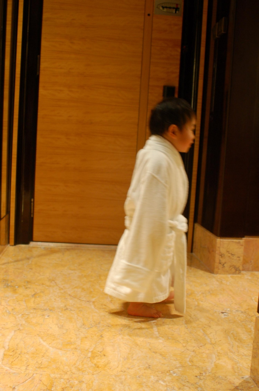 写真は、子供用バスローブを着て動き回るわが子。