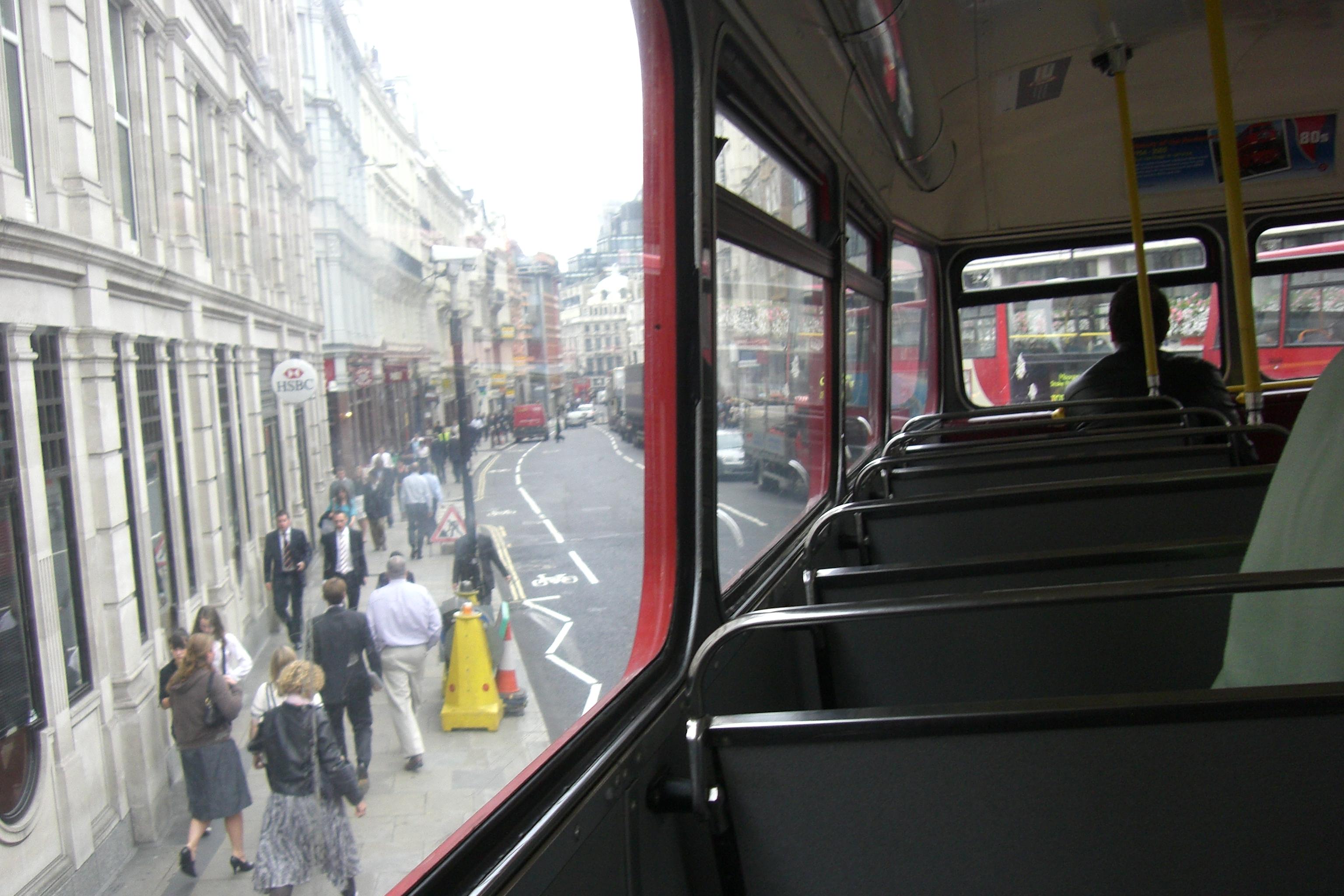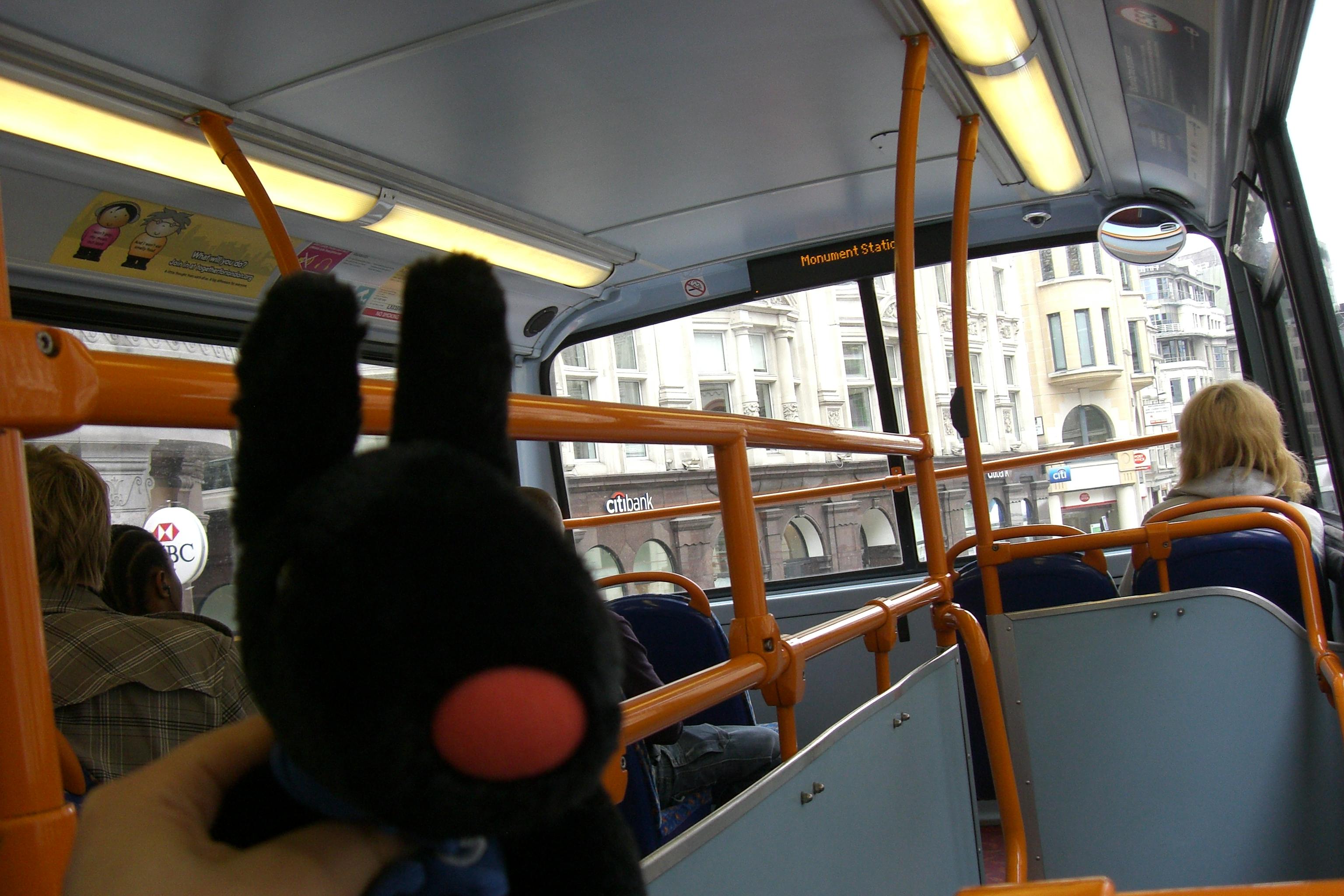 停留所で一応確認し、やってきたお目当てのバスへ乗車。バスの前に番号と行き先が書いてあるのは日本と同じなので大丈夫。早速2階部分へ。
