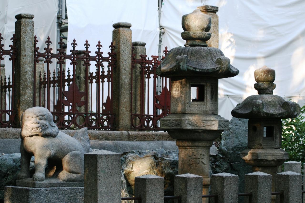 可愛らしい、阿吽形の雌雄の狛犬が置かれていた、末社らしい建物の周りの光景です。